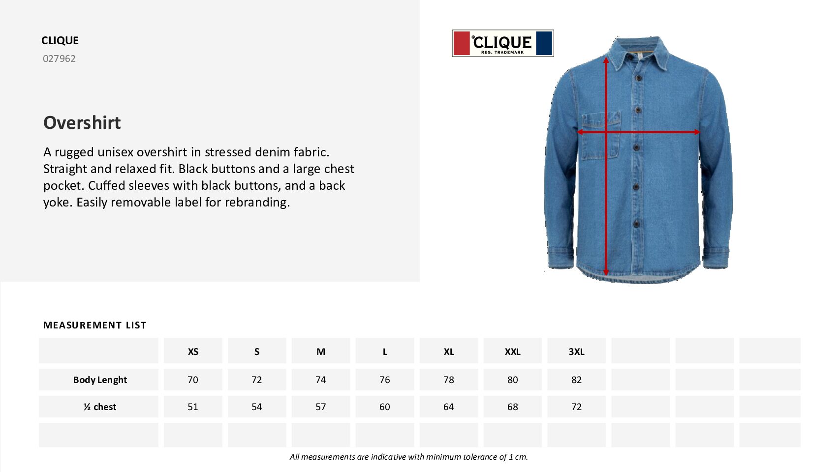 Rak och avslappnad passform med svarta knappar och stor bröstficka. Ärmar med manschetter och svarta knappar, samt ok i ryggen. Lätt avtagbar etikett för ommärkning.